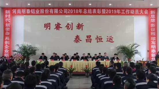 河南明泰鋁業股份有限公司2018年度總結表彰暨2019年工作動員大會于2019年1月11日上午在公司禮堂順利召開,鞏義市產業集聚區管委會副主任、回郭鎮黨委書記王躍舉,公司董事長馬廷義,副董事長化新民、杜有東,總經理劉杰及500余名干部職工參加會議。